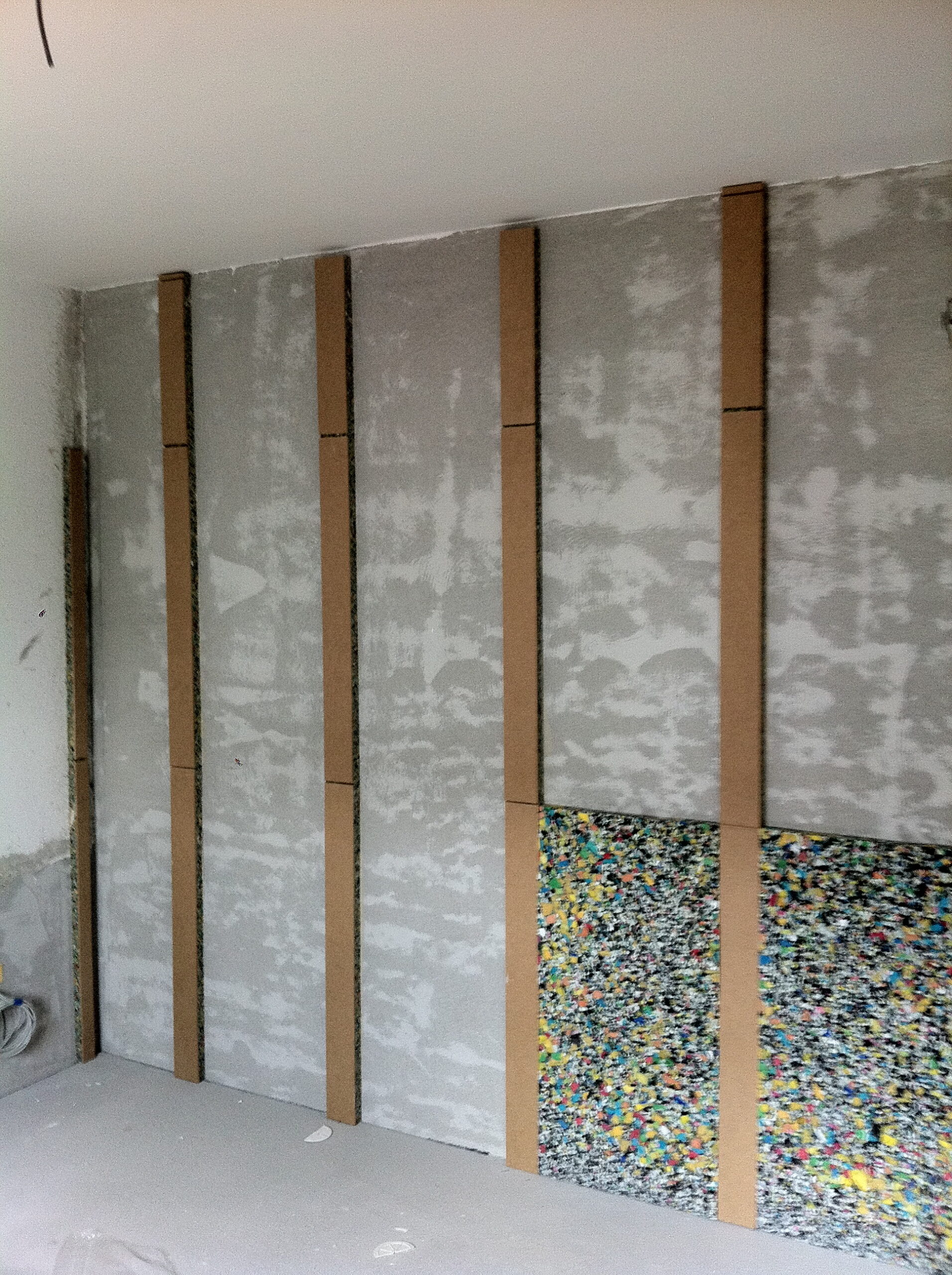 • poltrda zvočno izolacijska pena debeline 3,5 cm vstavimo med letvice z oblogo iz tanke pene, ki jih prilepimo na steno